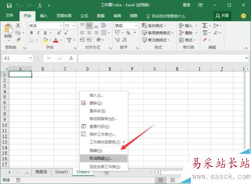4、如果我們又需要將隱藏的工作表顯示出來。則選中工作簿中任意一個工作表的標簽,點擊鼠標右鍵,在彈出的菜單選項中點擊“取消隱藏”選項。如圖所示;
