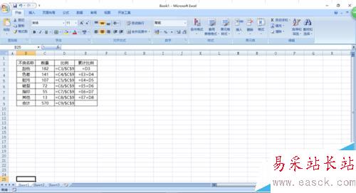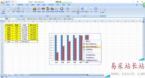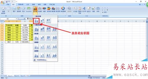 3、按ctrl選擇圖中黃色區域(不良名稱、數量、累計比例,注意合計那一行不要選),插入→柱形圖,選擇二維柱形圖中的簇狀柱形圖。