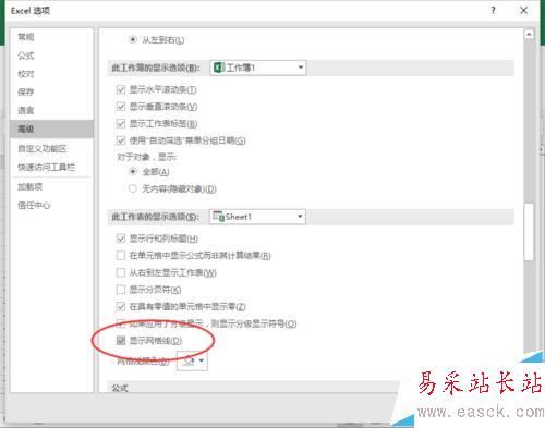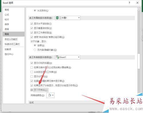 6、在高級選項卡欄的右側窗格中,找到“此工作表的顯示選項”區域下的“顯示網格線”選項,在默認情況下這個選項是勾選的。如圖所示;