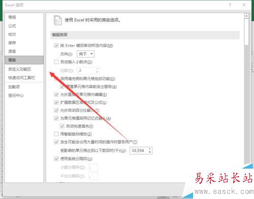 5、在Excel選項對話窗口中,將選項卡切換到“高級”選項卡欄。如圖所示;