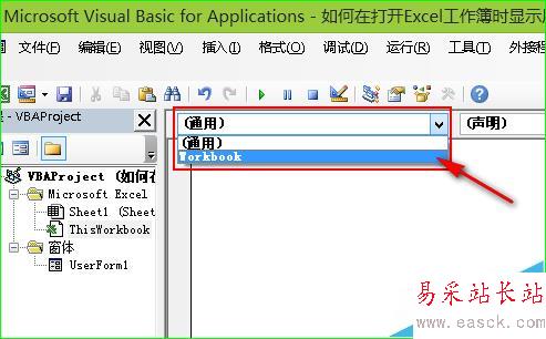 5、核心步驟——為ThisWorkBook添加代碼。首先,雙擊資源管理器中的“ThisWorkBook”,如圖所示;在打開的代碼編輯環境下,點擊“通用”下拉框,選擇“WorkBook”,如圖所示;在出現的事件過程中添加如圖所示的代碼——在打開工作簿時自動立即用戶窗體的關鍵代碼。