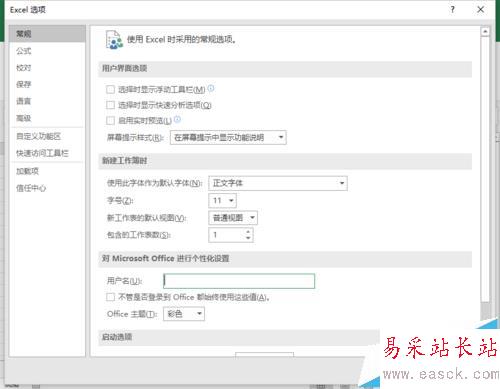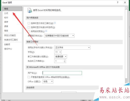 5、在Excel選項對話窗口中,將選項卡切換到“常規”選項卡欄。如圖所示;