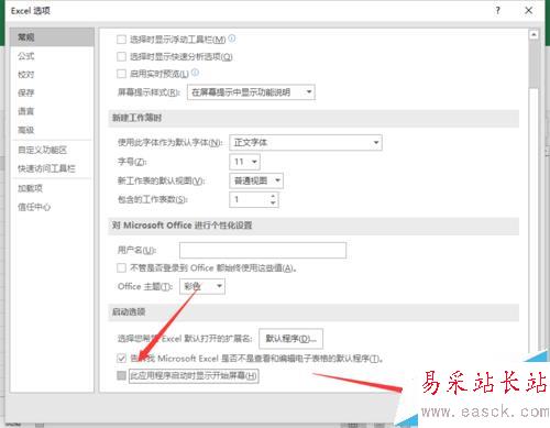 6、在“常規”選項卡的右側窗格中,找到“啟動選項”組中的“此應用程序啟動時顯示開始屏幕”選項,并在其復選框中取消“√”,然后再點擊“確定”按鈕即可。如圖所示;