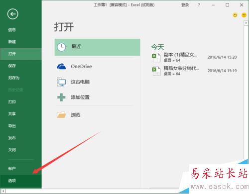 3、在打開文件選項對話窗口中,選擇中左側窗格下方的“選項”命令點擊它。如圖所示;