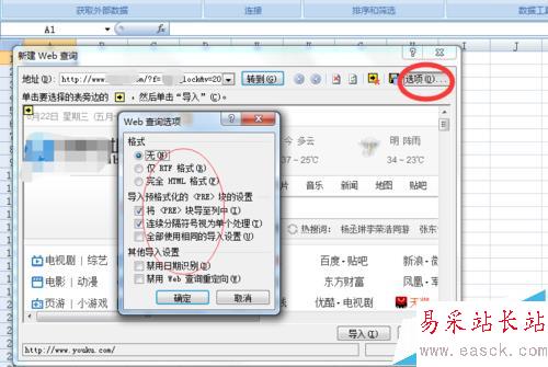 5、在新建web查詢對(duì)話框上找到選項(xiàng),可以對(duì)查詢的數(shù)據(jù)進(jìn)行設(shè)置,這里就選擇默認(rèn)設(shè)置了。