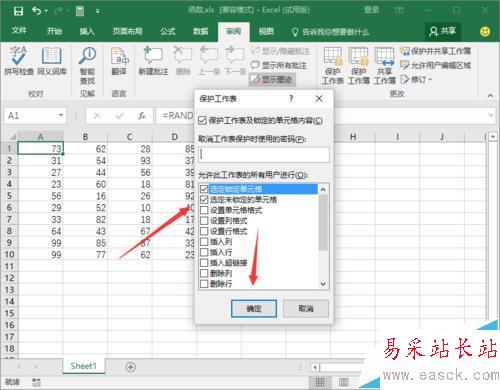 8、在彈出的保護工作表對話框中,勾選“選定鎖定單元格”和“選定未鎖定的單元格”這兩個選項,然后再點擊“確定”按鈕。如圖所示