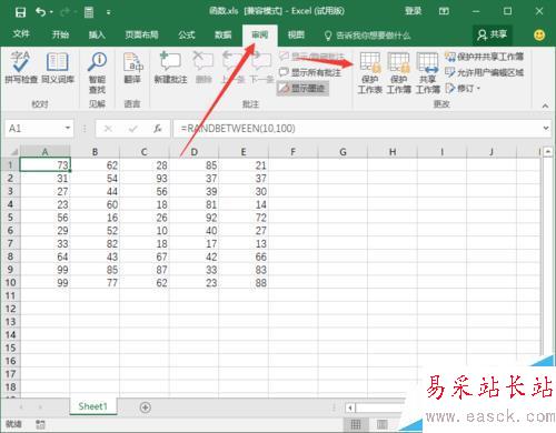 7、返回到Excel編輯窗口,將菜單選項卡切換到“審閱”選項卡欄,再點擊“更改”分區功能區的“保護工作表”選項。如圖所示;