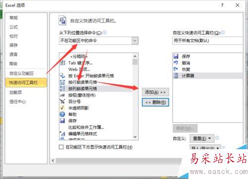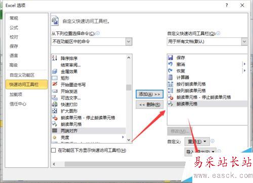 6、在“快速訪問工具欄”選項的右側窗格中,在“從下列位置選擇命令”中選擇“不在功能區的命令”,再將“按行朗讀單元格,按列朗讀單元格,朗讀單元格-停止朗讀單元格,朗讀單元格”添加到“自定義快速訪問工具欄”。如圖所示;