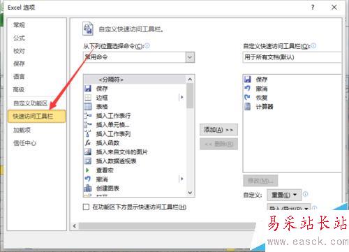 5、在“Excel 選項”對話框中,選擇左側窗格的“快速訪問工具欄”選項并點擊它。如圖所示;