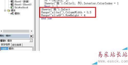 7、編程,通過讀取“數據”表格里的數據,找到“魚”表格里相應的單元格,涂色,這里我們圖的是黑色。