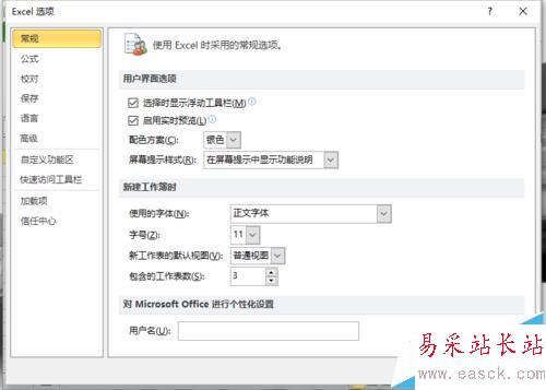 4、點(diǎn)擊“選項(xiàng)”命令選項(xiàng)后,這個(gè)時(shí)候會(huì)彈出工作簿的“Excel選項(xiàng)”對(duì)話框。如圖所示;