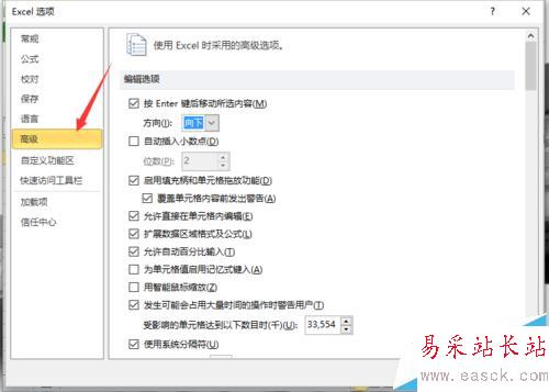 5、在彈出的“Excel選項(xiàng)”對(duì)話框中,選擇并點(diǎn)擊“高級(jí)”選項(xiàng)卡欄。如圖所示;