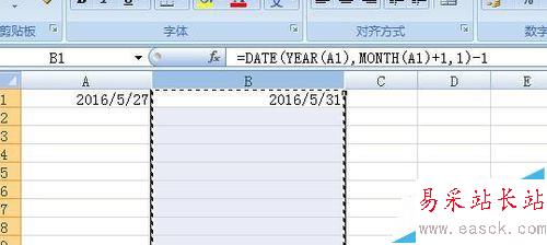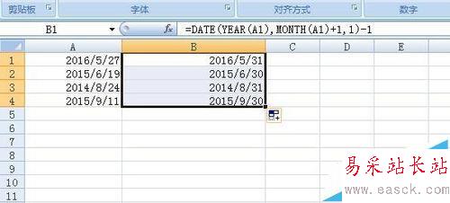 4、那么在excel的B單元格中輸入,=DATE(YEAR(A1),MONTH(A1)+1,1)-1,這就是獲取下一個(gè)月的一號(hào),然后減去1,計(jì)算出上一個(gè)月的最后一天