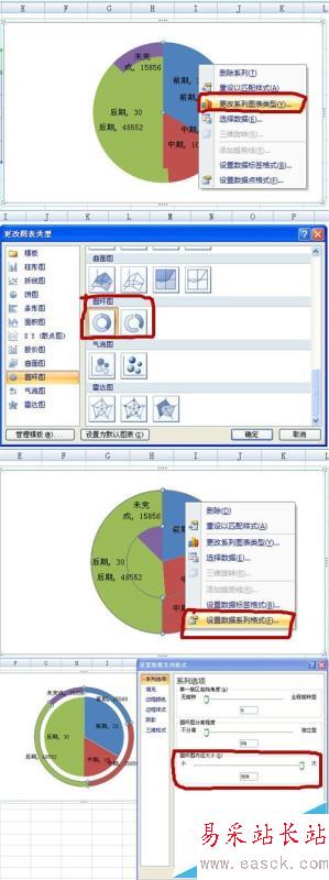 5、選擇外層圖表,點擊鼠標右鍵并在彈出菜單中選擇【更改系列圖標類型】,并在彈出的窗口中圖形選擇【圓環圖】,點擊【確定】。同樣地,還是選擇外層圖表,點擊鼠標右鍵并在彈出菜單中選擇【設置數據系列格式】,設置【圓環圖內徑大小】數據,點擊【確定】。