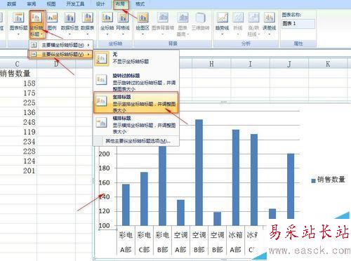 3、坐標軸間隔設置完成了,我們要在坐標軸上增加標題,怎么做呢,操作如下:單擊選中縱坐標,選中菜單欄中的【布局】-【標簽】-【坐標軸標題】-【主要縱坐標標題】-【豎排標題】,在彈出的文本框中填入“銷售數量”