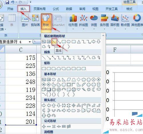 5、這時候問題來了,但是這里由于橫坐標有兩行,一行是產品一行是部門,所以我們在文本框中需要填入“產品部門”,按回車鍵換行,將產品和部門分成兩行。然后選中菜單欄中的【插入】-【插圖】-【形狀】,選擇直線,繪制在產品和部門之間。將直線的顏色設置為黑色。