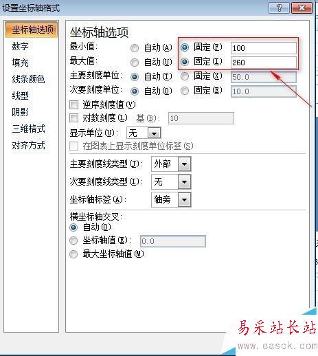 2、單擊選中Y坐標軸,右擊鼠標,在彈出的對話框中選擇“設置坐標軸格式”,進入坐標軸格式屬性窗口,在“坐標軸選項”區域內將最小值和最大值分別設置成100,260.設置完成后效果如下。