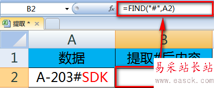 2、首先,在B2中輸入公式:=FIND("#",A2),返回#在字符串中的位置,#在A2單元格文本中是第6個字符。