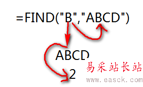 3、知識點說明:FIND()函數查找第一參數在第二參數中的位置。如下圖,查找“B”在“ABCD”中是第幾個字符。第一參數是要查找的字符“B”,第二參數是被查找的字符串。最終返回“B”在“ABCD”中是第2個字符。