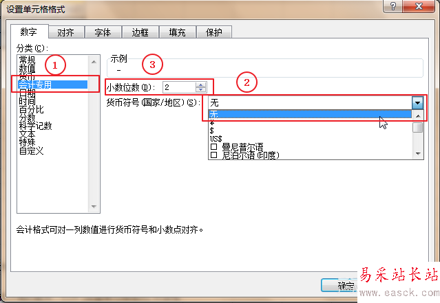 2、[分類] 中選擇會計專用, [貨幣符號(國家/地區)(s)] 選項選擇“無”。如果不需要顯示小數,小數位數修改為0。確定