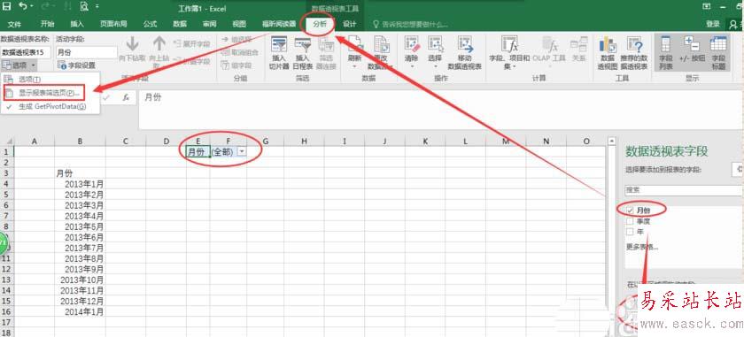 2、通過數據透視表,做個透視圖,將右邊的月份拉到篩選器,點擊上面的分析-->選項,報表篩選頁,確定即可。