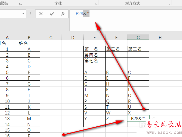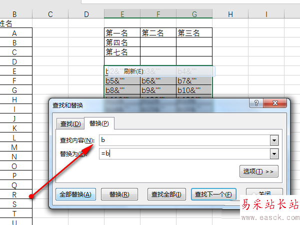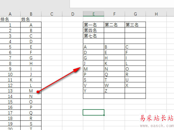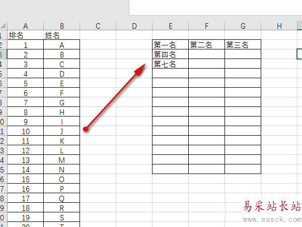 1、如果我們有左邊這樣一個原始表格,需要按名次將姓名依次輸入右邊的這個表格,你有什么好辦法嗎?今天我來介紹一個小技巧:用替換一次輸入多個公式。