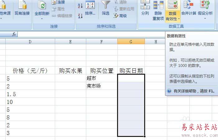 3、鼠標左鍵框選購買位置這一列,然后單擊在【數據有效】菜單上單擊一下,如下圖所示。