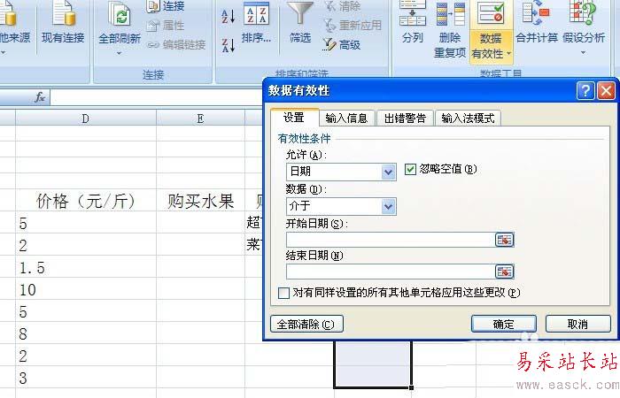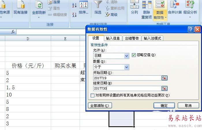 5、在【數據有效】窗口上,輸入日期的起始時間和結束時間,這樣條件判斷時,超出時間范圍的日期,就提示錯誤,并不能輸入,如下圖所示。