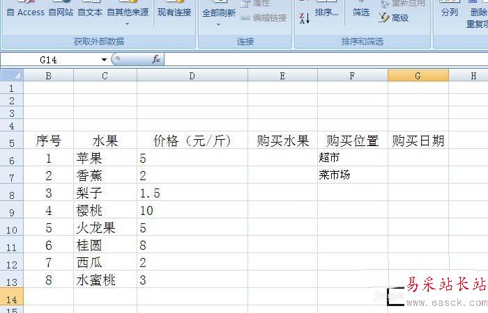 2、在購買水果單元格的后面添加一個名稱,如購買日期,這樣把不同的購買日期都輸入進去,如下圖所示。