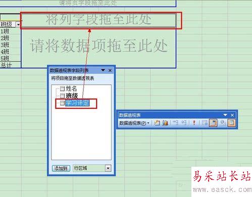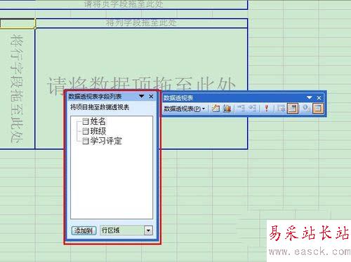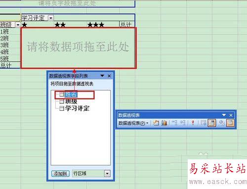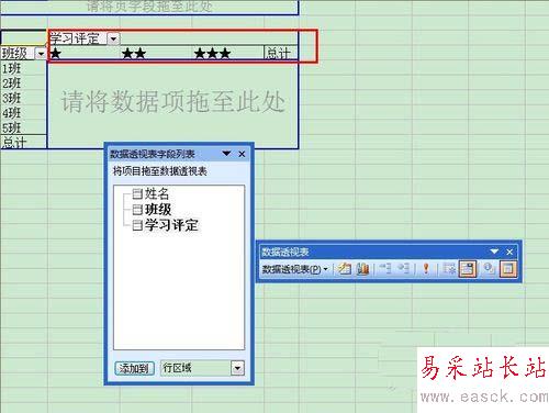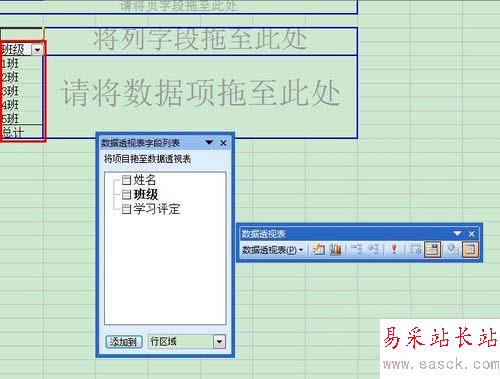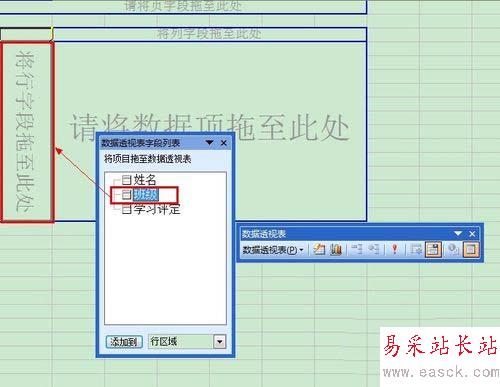 6、 從“數據透視表字段列表”中將“班級”字段拖至“請將行字段拖至此處”;
