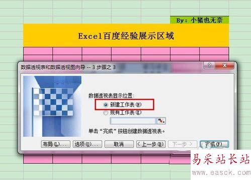4、 在彈出第三個對話框中,在“數據透視表顯示位置”選擇第一項“新建工作表”,最后單擊“完成”按鈕。