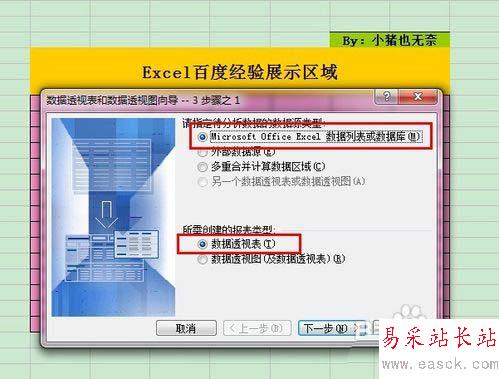 2、 然后單擊“數據”菜單中的“數據透視表和數據透視圖…”命令項。接著按“數據透視表和數據透視圖向導”提示進行操作。在彈出的步驟一設置對話框中的“請指定待分析數據的數據源類型”中選擇“Microsoft Excel數據列表或數據庫”項。在“所需創建的報表類型”中選擇“數據透視表”項,然后單擊“下一步”按鈕。