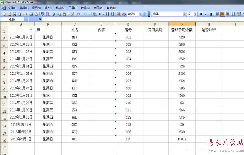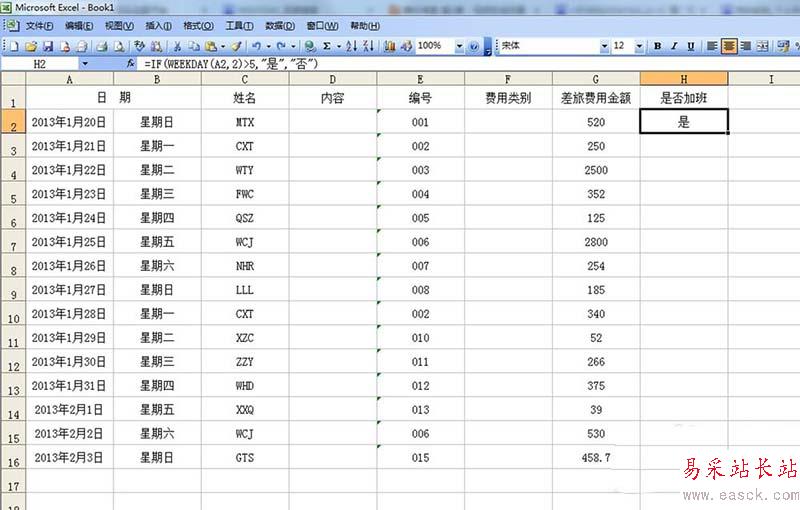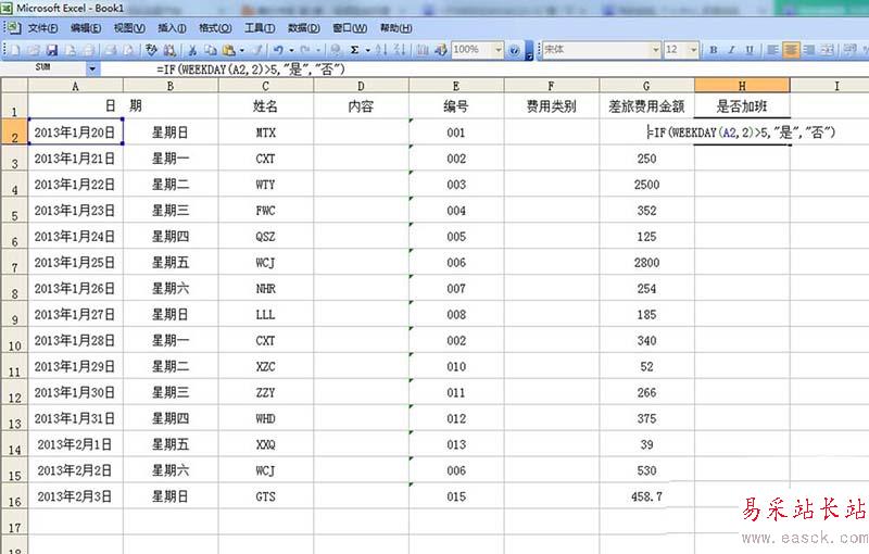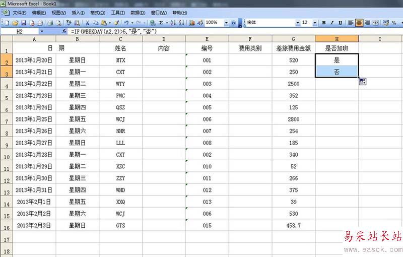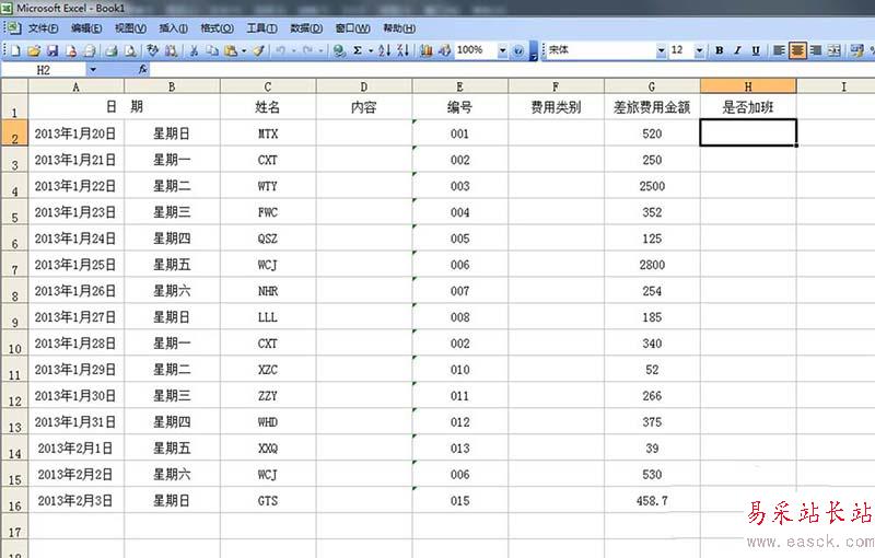2、在是否加班的一欄的單元格上定位,也就是H2。
