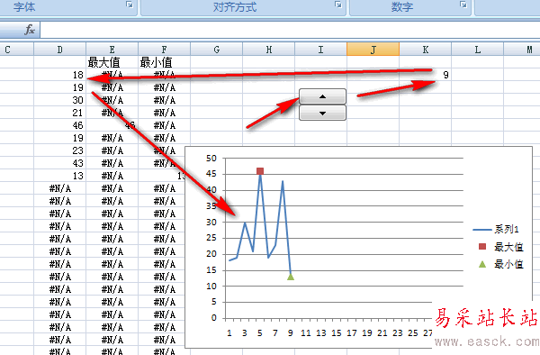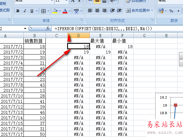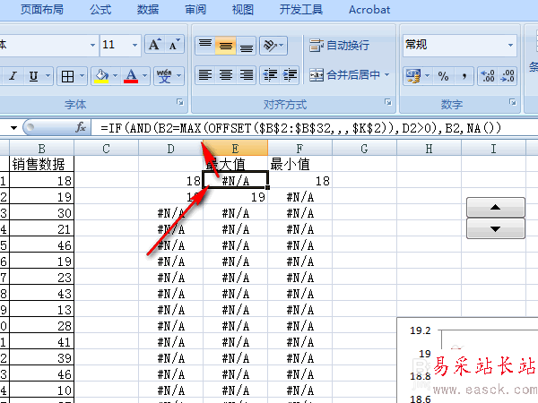 6、在E列輸入公式:=IF(AND(B2=MAX(OFFSET($B$2:$B$32,,,$K$2)),D2>0),B2,NA()),取D列的最大值。