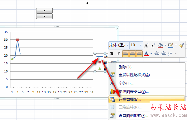 8、選擇A2:B32,插入折線圖,選中這條橫線,右鍵單擊選擇數據。