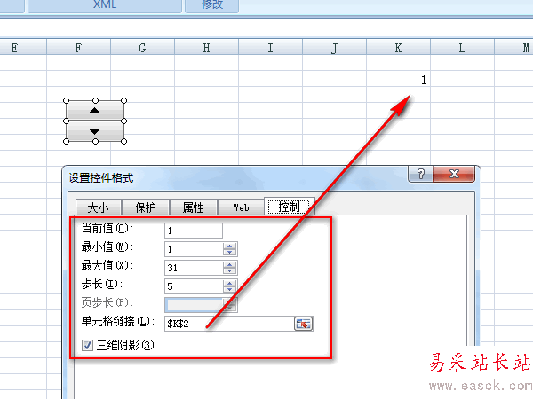 4、最小值為1,最大值為31,步長5左右,如果步長大,變化次數少,細節體現不全面。將單元格鏈接到k2,調節按鈕,k2的數據就會變化了。