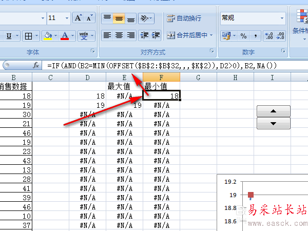 7、在F列輸入公式:=IF(AND(B2=min(OFFSET($B$2:$B$32,,,$K$2)),D2>0),B2,NA()),取D列的最小值。