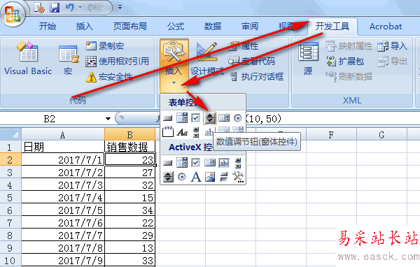 2、點擊——開發工具——插入——表單控件——數值調節鈕。