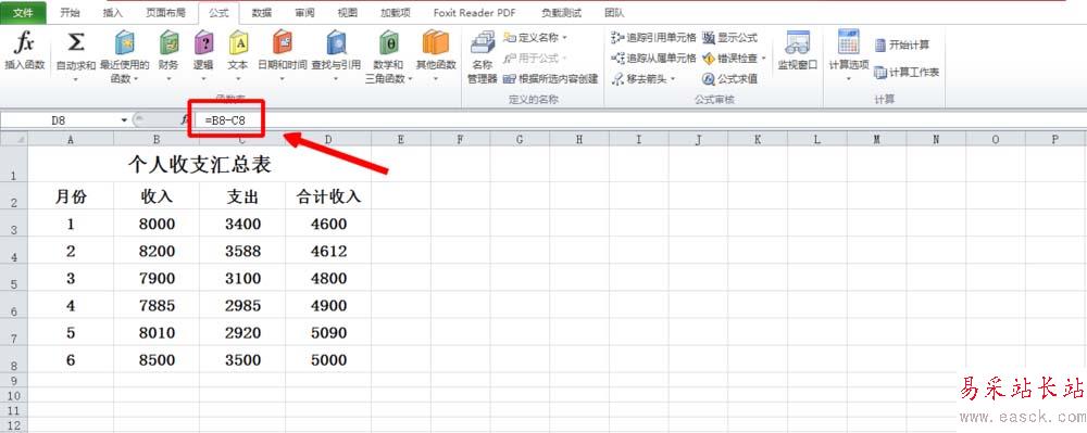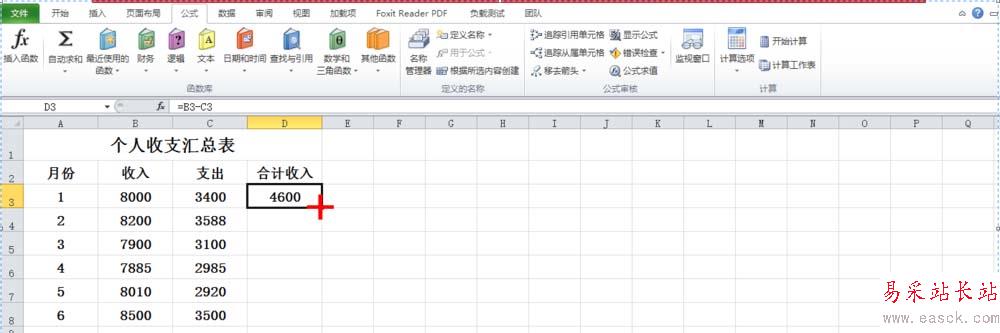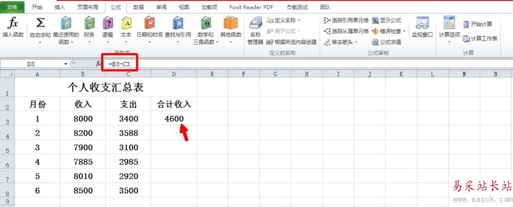 2、在收入合計欄位輸入公式 :=B3-C3(收入減去支出)。回車后帶出結(jié)果。