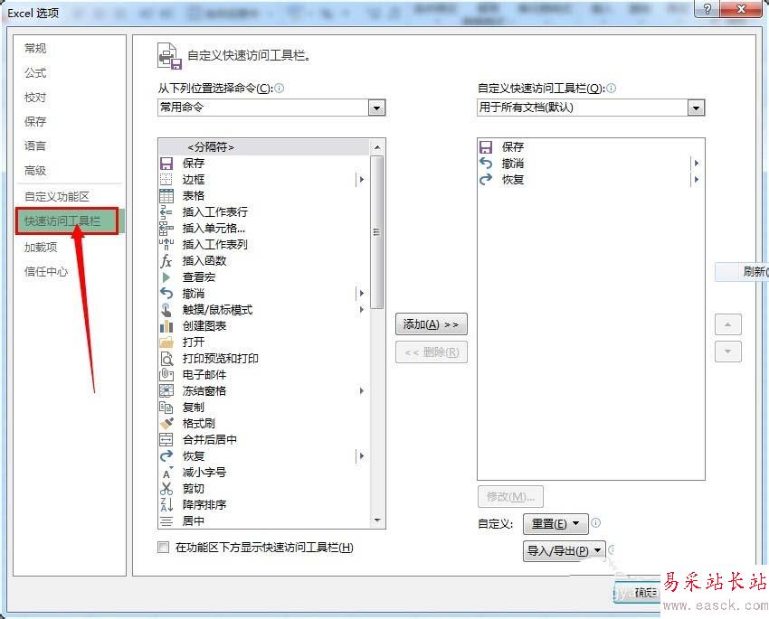 3、在彈出的【excel選項】對話框中點擊【快速訪問工具欄】。
