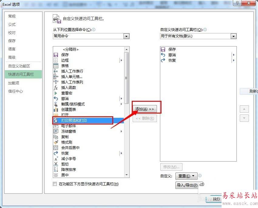 4、在右邊的選項欄中找到【快速預覽和打印】,左鍵點選,然后點擊【添加(A)】,如圖所示。