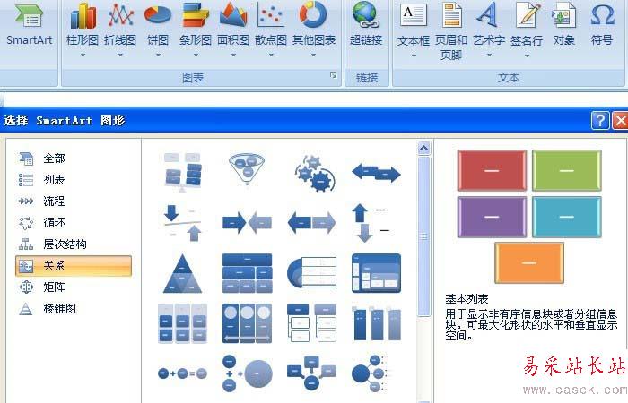 在用Excel制作表格時(shí),制作好了一個(gè)數(shù)據(jù)表,有時(shí)需要使用不同效果的關(guān)系圖表,這里可以用SmartArt工具。那么,Excel表中如何使用關(guān)系圖呢?大家參考以下幾步,很快可以在Excel表中使用關(guān)系圖了。