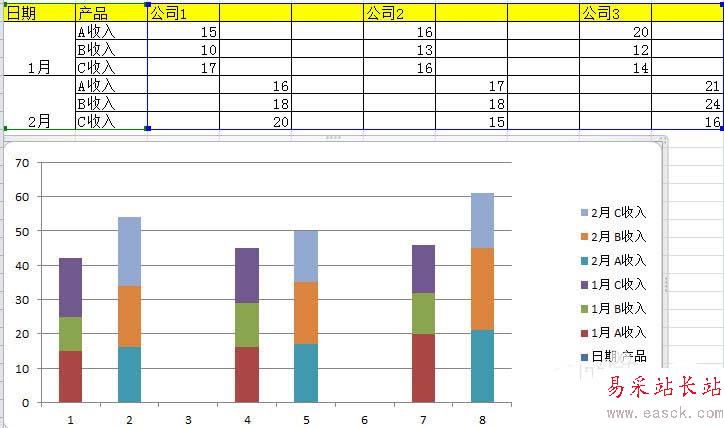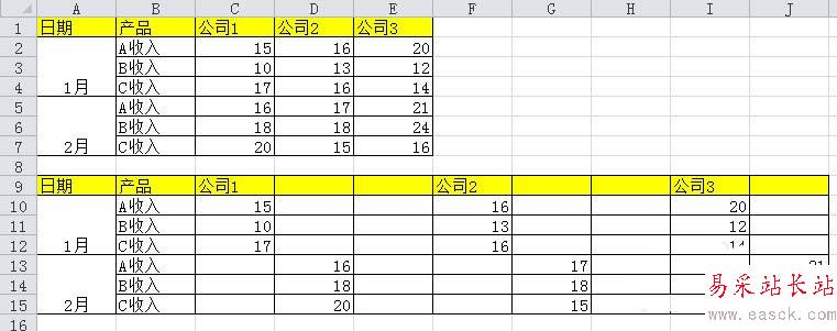 1、整理基礎數據,將基礎數據每類數據根據月份按列錯開,同時將不同公司類別的數據,以列間隔開,見圖所示。