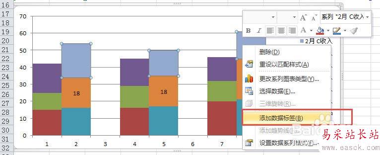 4、下面我們增加柱狀圖上的數據標簽,選中柱狀圖,右鍵,在彈出的菜單中選擇“增加數據標簽”該動作需要在每個柱狀圖的類別上進行操作。