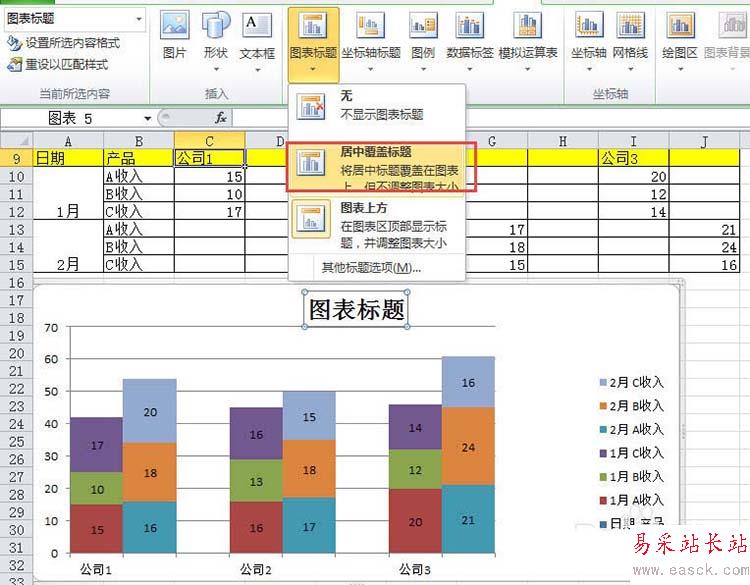 6、最后,我們來為表格增加標題,選中表格,在菜單欄中選擇“布局”選項卡,點擊圖表標題,選擇“居中覆蓋標題”即可,修改標題名稱,即可得到我們的目標多層柱狀圖。