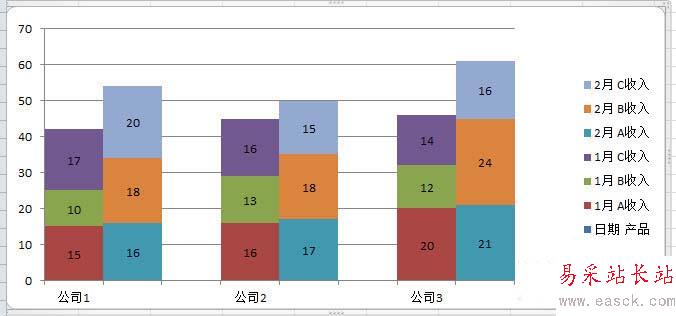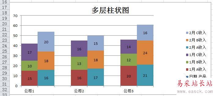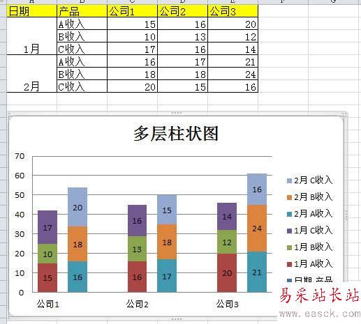 excel處理數據時,有時為了更好的顯示數據的對比,特別是不同類別數據對比時,往往會用到多層柱狀圖,這里我們就介紹多層柱狀圖的創建方法,圖片為基礎數據和我們最后生成的多層柱狀圖。