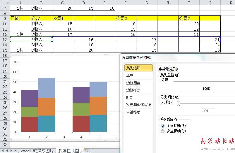 3、下面我們對多層柱狀圖的格式進行調整,選中柱狀圖,右鍵,在彈出菜單中選擇“設置數據系列格式”,將“分類間距”左移至0,此時柱狀圖調整為目標柱狀圖的距離間隔。