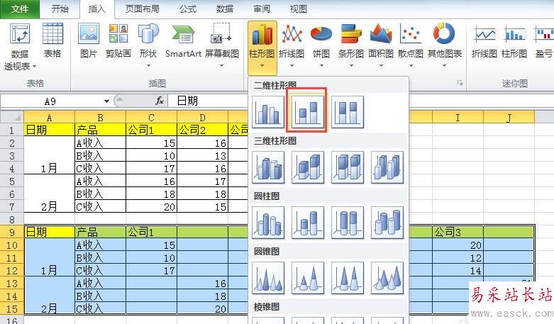2、選中整理后的基礎數據,在插入菜單選項卡中,點擊插入圖表,選擇柱狀圖,在二維柱狀圖中,選擇第二個,點擊確定后,就會得到一個基礎的多層柱狀圖。
