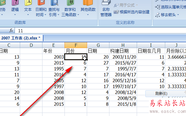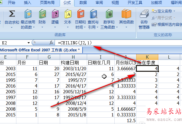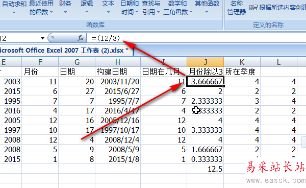 5、用產生的月份除以3,得到一列數據x。如果我們讓這列數據x向上舍入最近的整數的話,就是我們要的季度數啦。