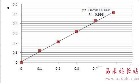 8、將試管6中的吸光度值代入圖表中得到的公式Y=1.025X+0.008后可得到所求成分的含量,即X的值。